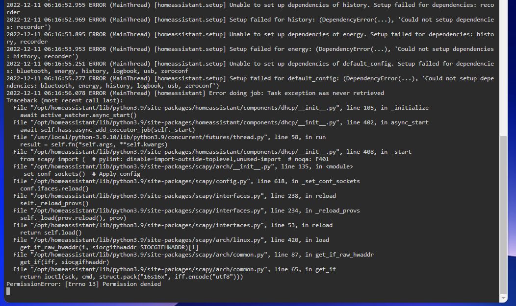 输入启动命令后 (homeassistant) root@localhost:/home# hass 长时间卡在: PermissionError: [Errno 13] Permission denied 不过能正常登录HASS使用,这个需要解决吗? 全部返回提示如下: 2022-10-19 15:47:16.721 ERROR (MainThread) [homeassistant] Error doing job: Task exception was never retrieved Traceback (most recent call last): File "/opt/homeassistant/lib/python3.9/site-packages/scapy/arch/common.py", line 65, in get_if return ioctl(sck, cmd, struct.pack("16s16x", iff.encode("utf8"))) PermissionError: [Errno 13] Permission denied