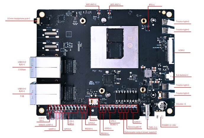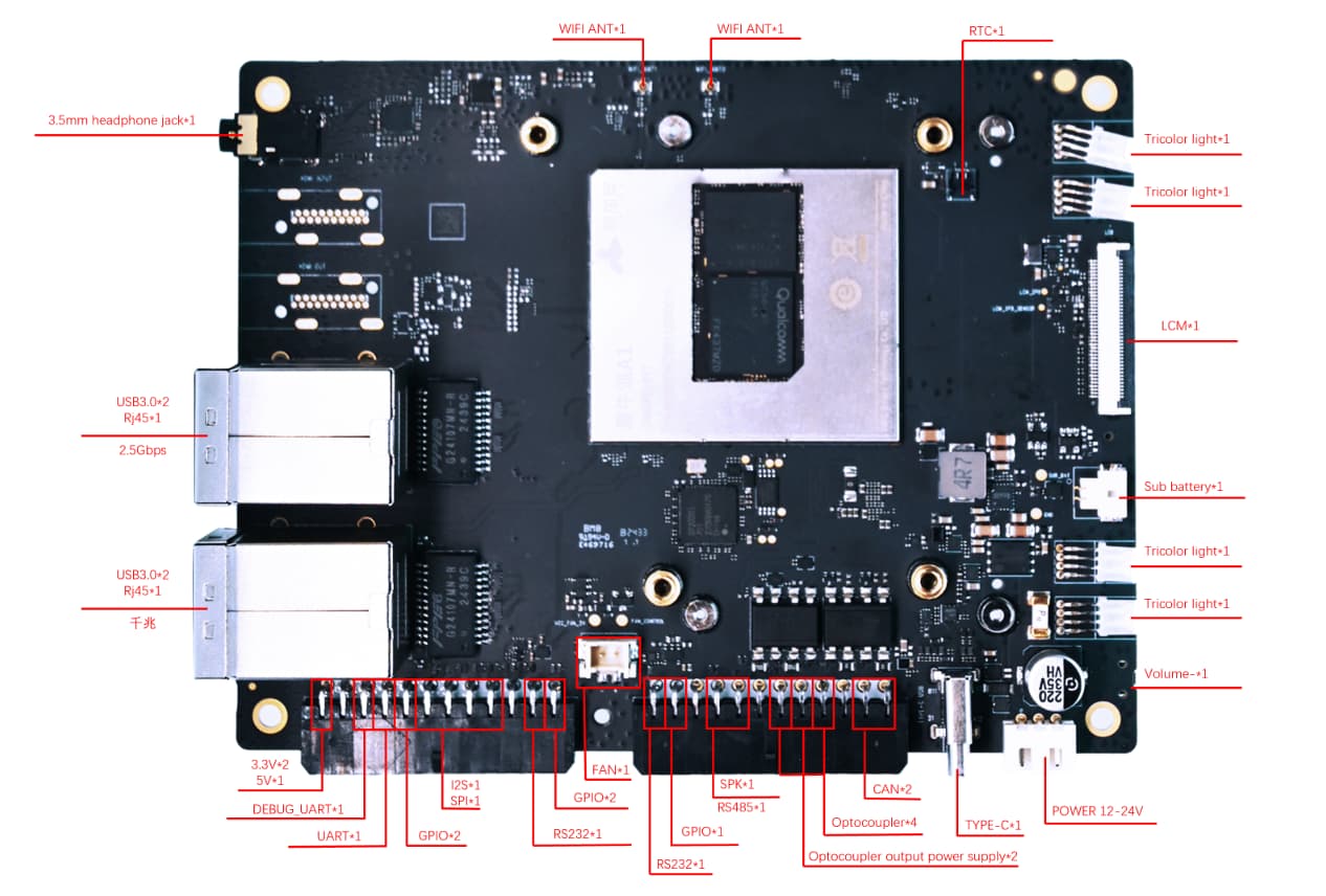 | 扩展接口 | CAN×2、RS232×2、RS485×1、光耦输入 / 输出 ×2(5~30V)、I2S×1、SPI×1、GPIO×5(3.3V)等 |