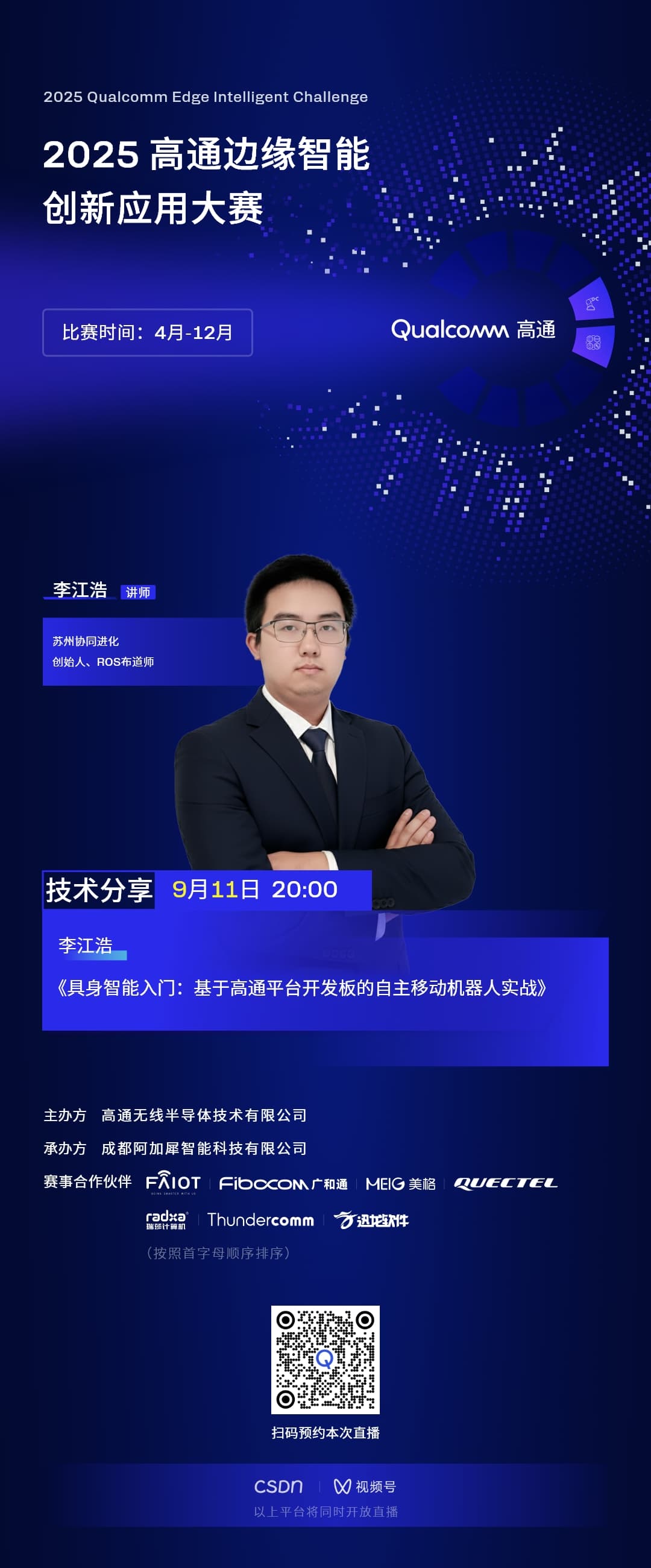 在边缘智能与机器人技术深度融合的今天,如何快速掌握具身智能机器人开发的核心能力?如何让算法从仿真环境无缝迁移至真实硬件?9月11日(本周四)20:00,2025高通边缘智能创新应用大赛复赛阶段技术分享第二课将为你带来实战解答。