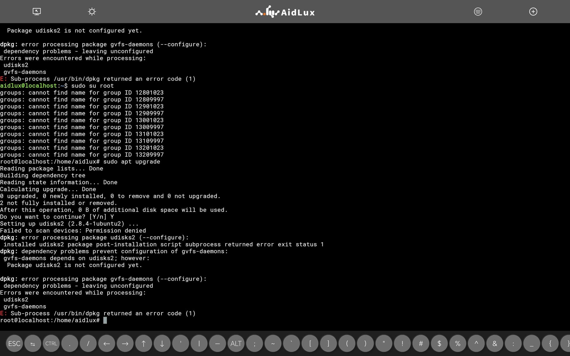 手机端的aidlux应该是可以apt upgrade 的,看你发的图,有2个库没安装好,导致dpkg执行不下去,你试试重新装一下报错的两个包呢
