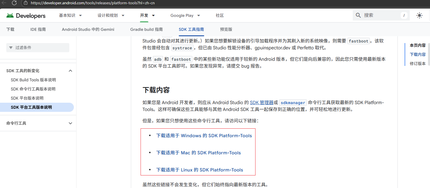 先去Android开发者官网下载相应的fastboot工具 SDK 平台工具版本说明 | Android Studio | Android Developers