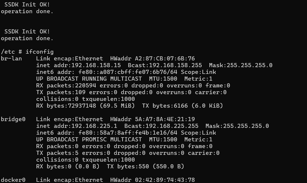 可通过ifconfig查询br-lan(设备端口的桥接管理)已为雷达默认上传地址,二者在同一网段下。