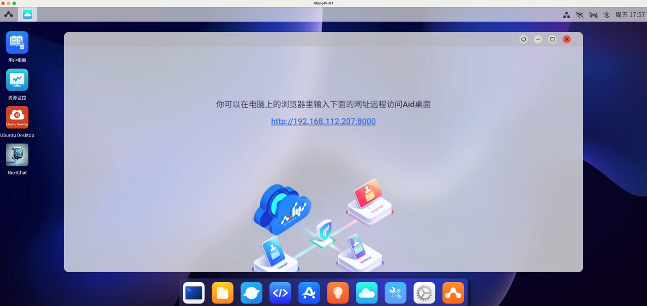 通过浏览器访问,连接设备,默认密码为aidlux,具体流程可参考: 浏览器登录 | APLUX Doc Center