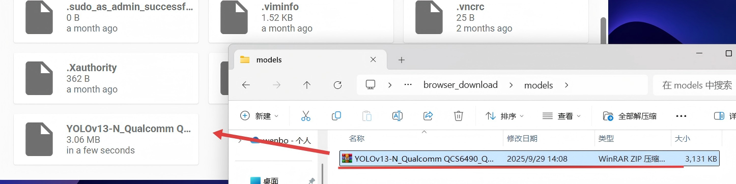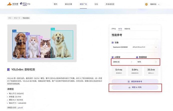选择yolov8模型后,可选择设备型号和需要的数据精度,点击模型和代码进行下载,得到的压缩包可拖拽至网页端打开的文件资源系统里(图中为其他案例的示意效果,演示拖拽压缩包上传)