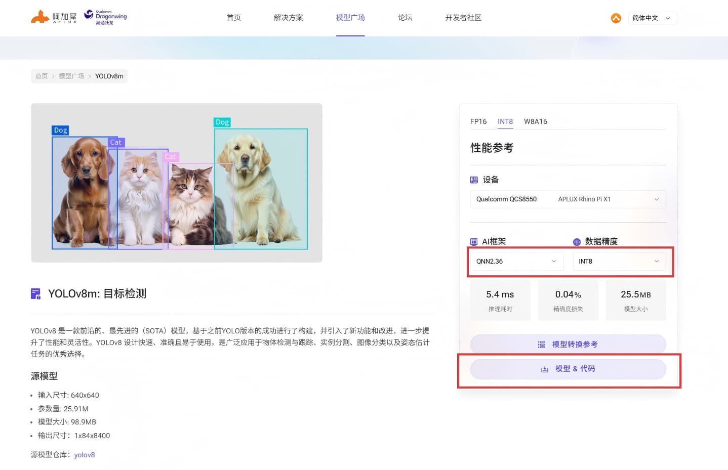 # 下载 yolov8m 模型,数据精度为 INT8, 针对 QCS8550 芯片平台优化,推理框架为 QNN2.36