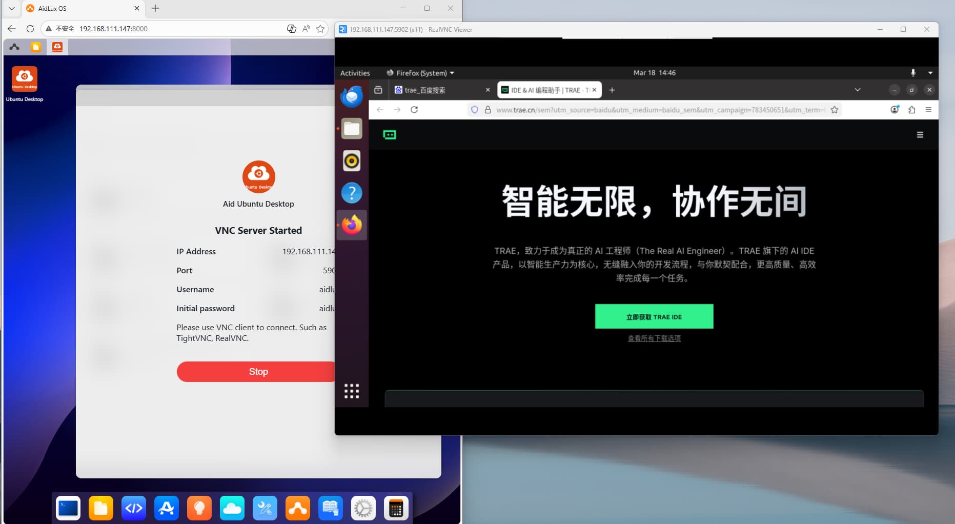 xfce 桌面变更为 ubuntu-desktop,支持通过本地xwayland 或者远程VNC 的方式访问AidLux 内置的ubuntu20.04 操作系统,同时配备火狐浏览器,可进行网页浏览和资源下载。