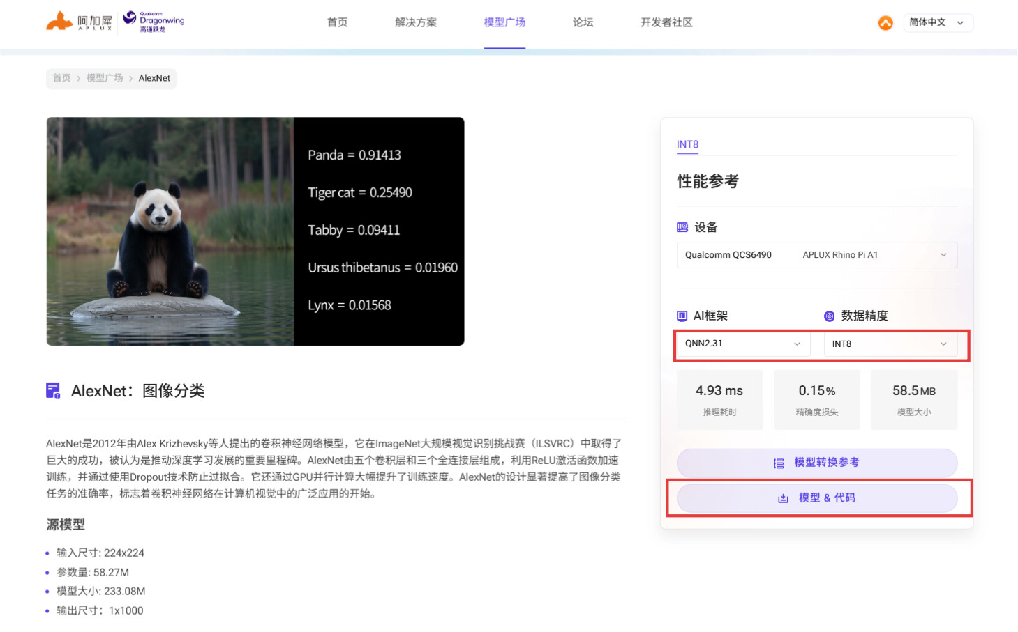 本次运行了模型广场上的AlexNet图像分类(QNN2.31,INT8)