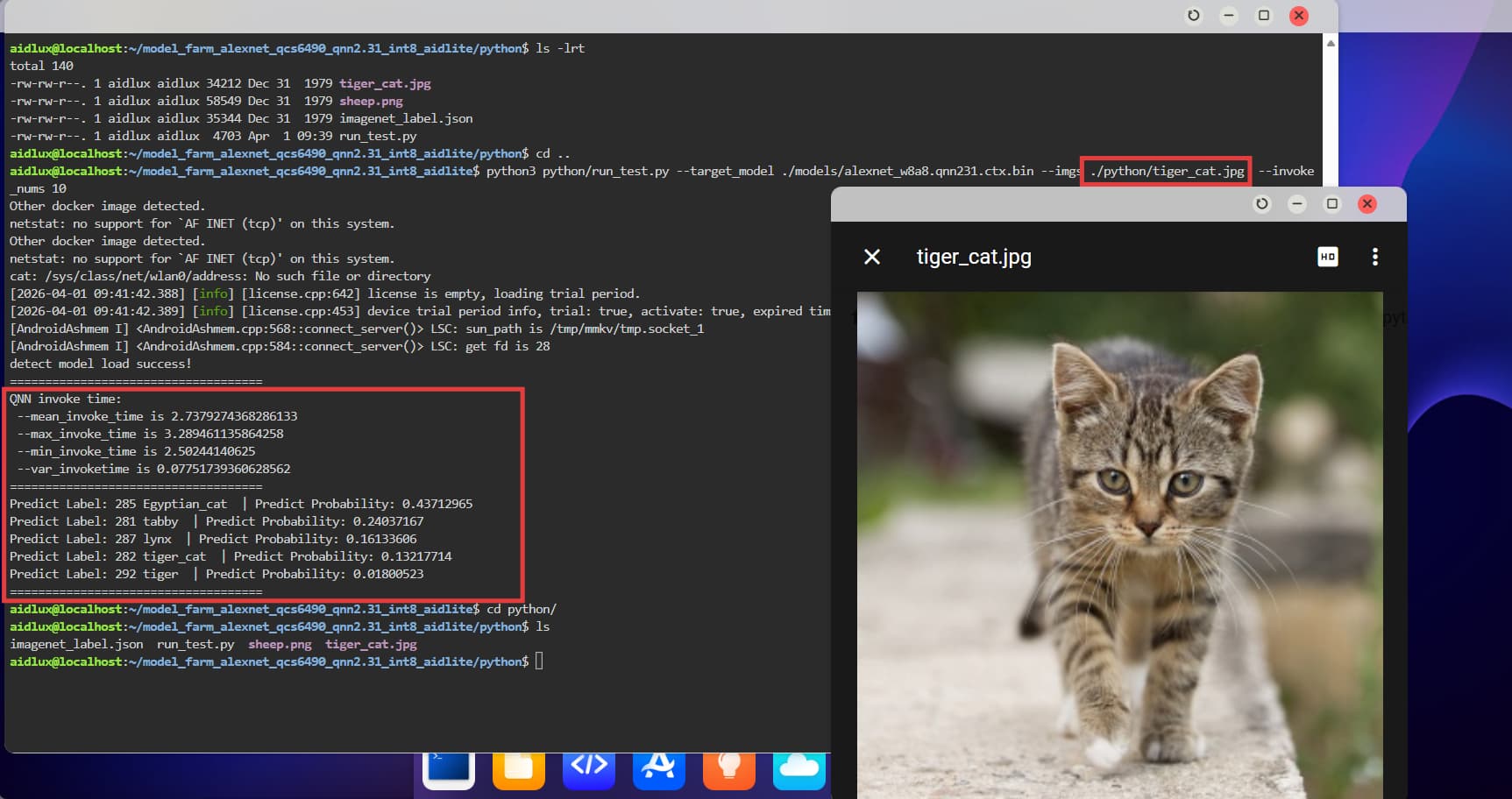 python3 python/run_test.py --target_model ./models/alexnet_w8a8.qnn231.ctx.bin --imgs ./python/tiger_cat.jpg --invoke_nums 10